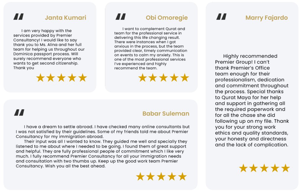Premier Consultancy are Government Authorised Agents to market and sell Caribbean Citizenship by Investment Programmes. Premier’s team are in direct contact with each Citizenship by Investment Unit (CIU), and government authorised lawyers to ensure that your application is compliant with legislation and processed efficiently